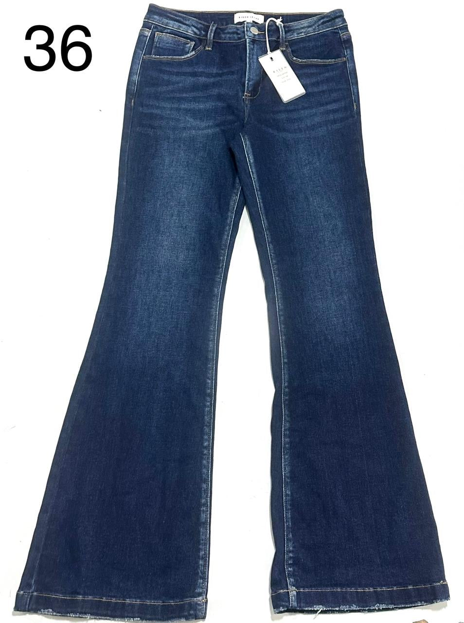 un jean évasé (flare) bleu foncé à taille mi-haute et jamais porté 🎫