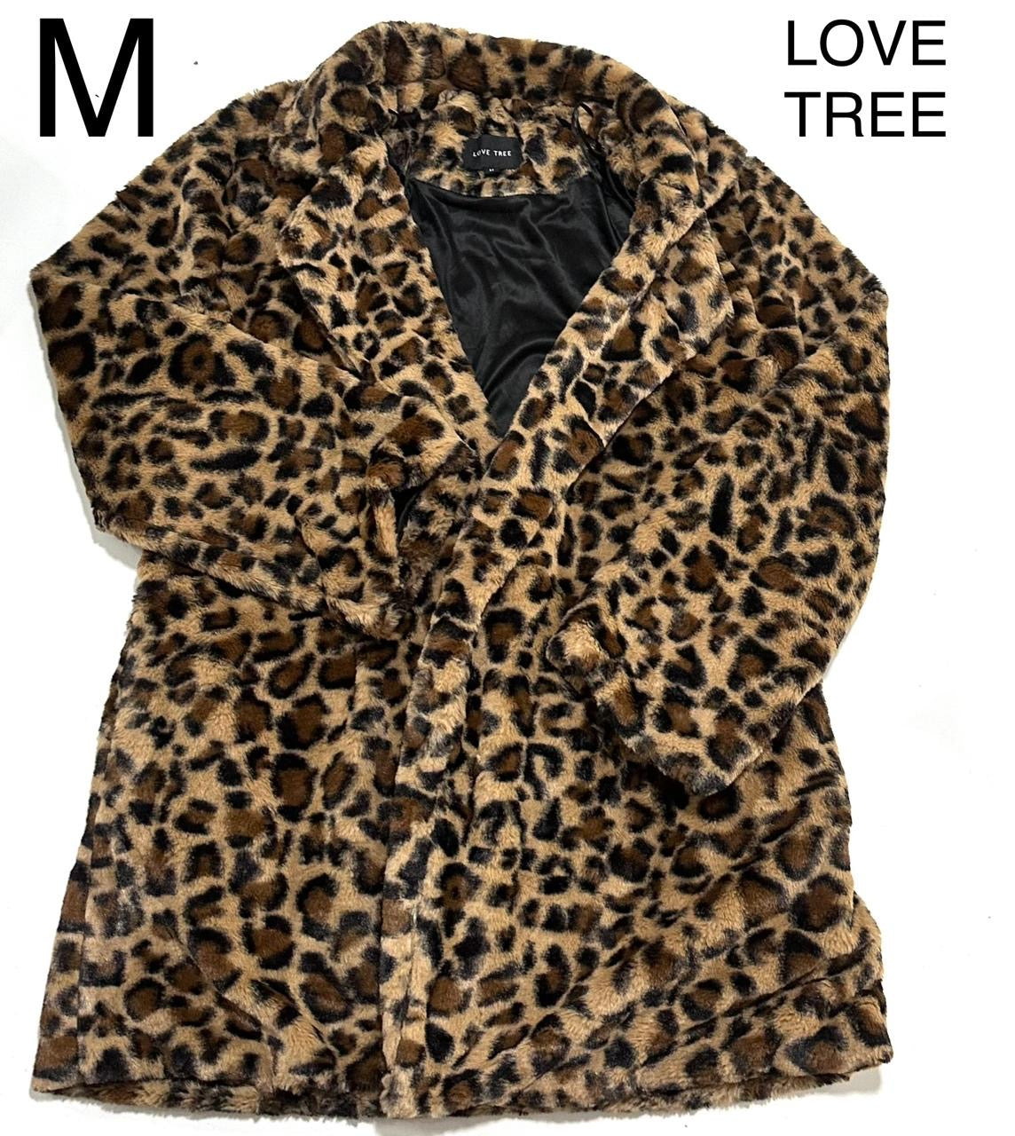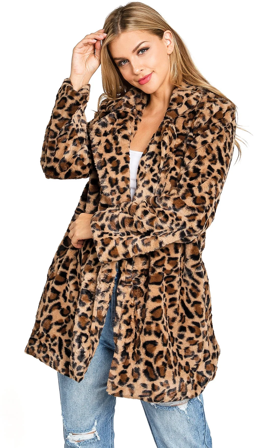 Un manteau long en fausse fourrure à imprimé léopard pour femme de la marque Love Tree.