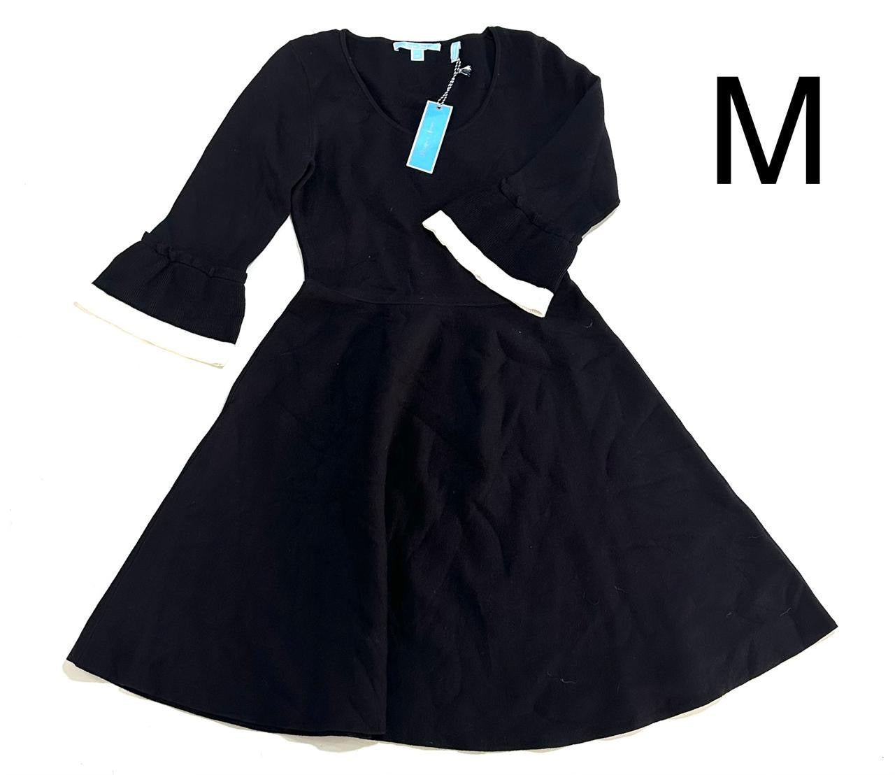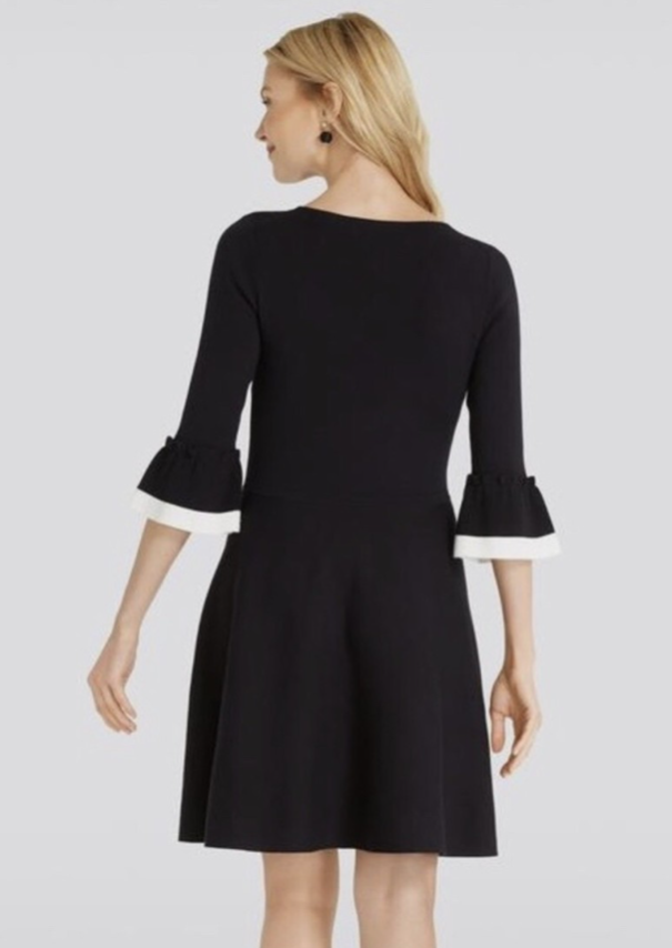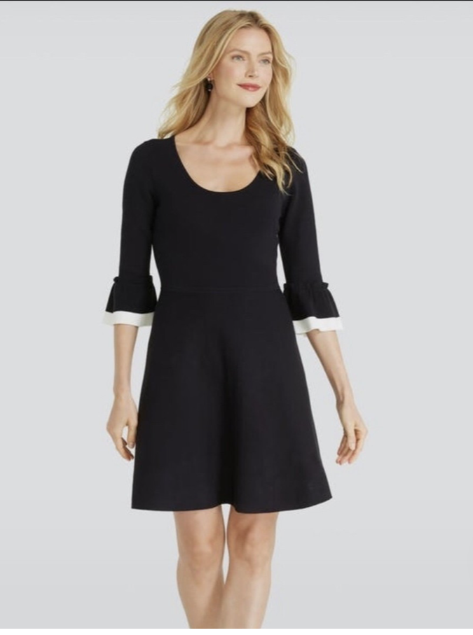 Cette robe noire évasée à manches trois quarts avec des volants blancs aux poignets est identifiée comme un modèle de la marque Draper James.
